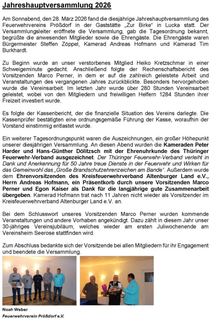 28.03.2026 Jahreshauptversammlung, Gaststätte „Zur Birke“ Lucka